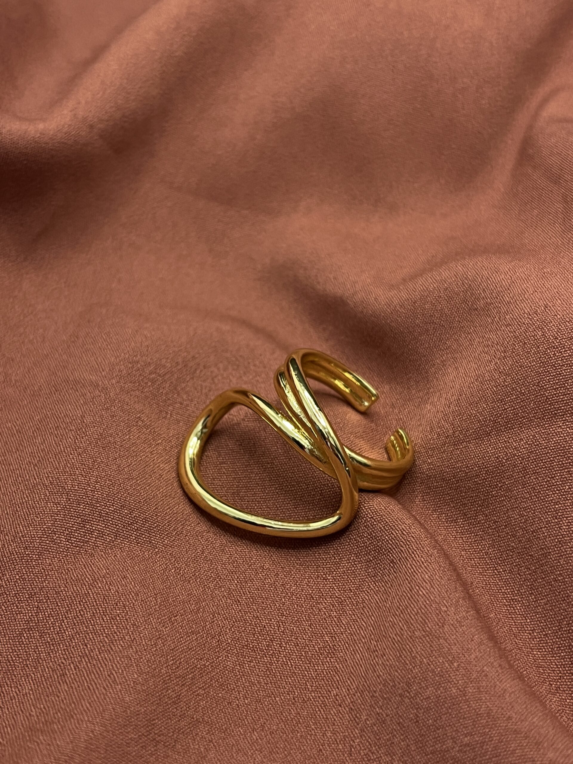 Designed with flowing, overlapping gold loops in an asymmetrical form, this ring embodies fluid artistry. It’s modern, expressive, and fashion-forward, making it a go-to piece for artistic elegance. Crafted in stainless steel with an anti-tarnish gold colored finish.