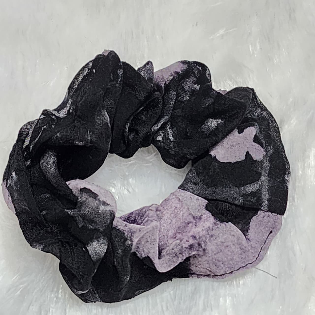 This scrunchie has a modern, artistic, or slightly edgy aesthetic, making it a great accessory for adding a pop of muted color and pattern to an outfit. A perfect accessory for a ponytail or a messy bun!