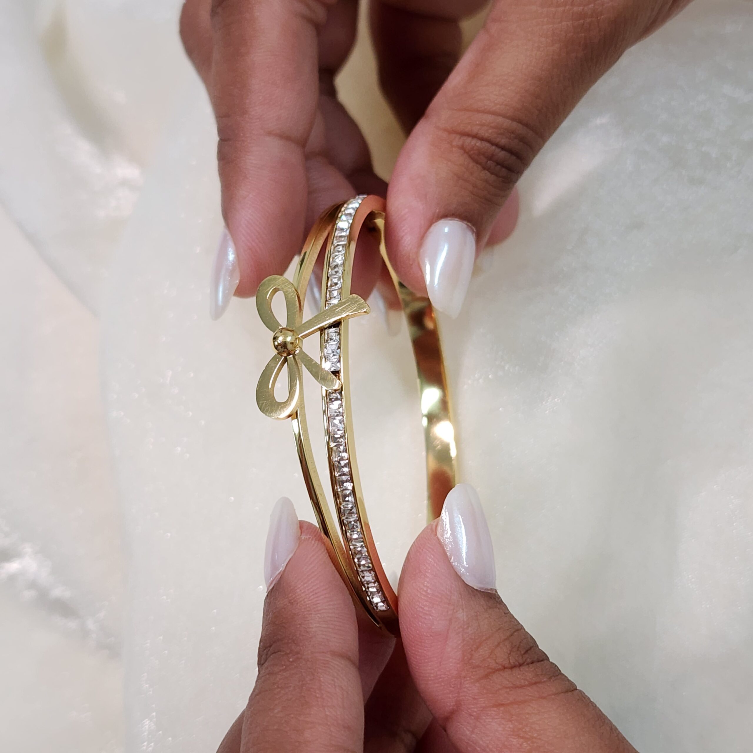 A double-banded gold-toned bangle featuring a delicate bow in the center. The lower band is encrusted with a single row of sparkling crystals, adding a touch of glamour to the design. |