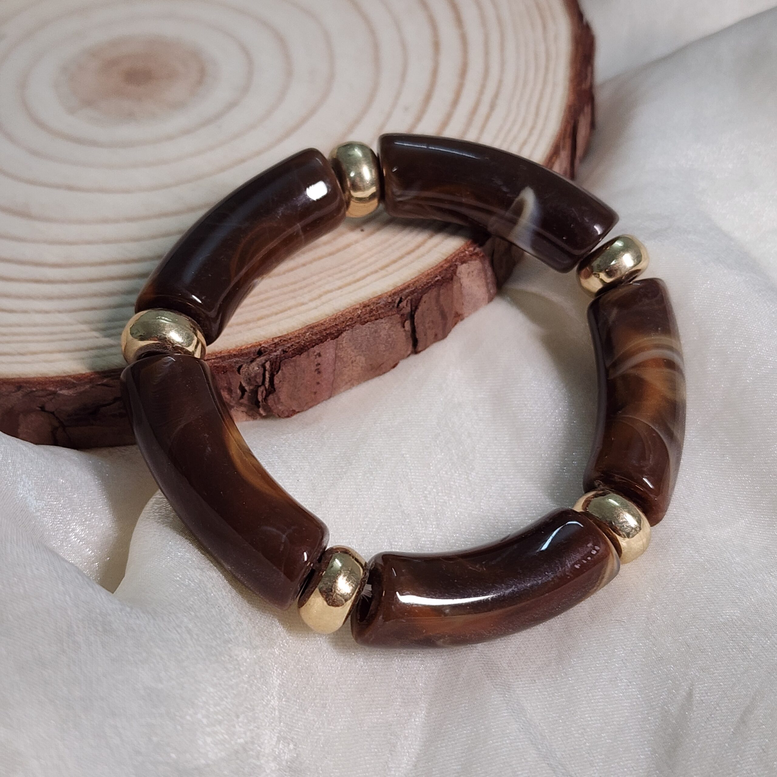 A stretch bracelet featuring smooth, curved beads with a swirling marbled pattern in shades of rich brown and cream. The beads are separated by small, round gold-toned accents, creating a warm and sophisticated design. |