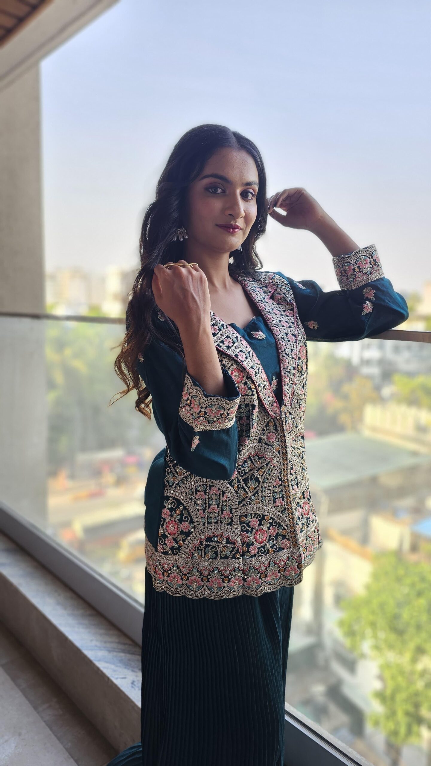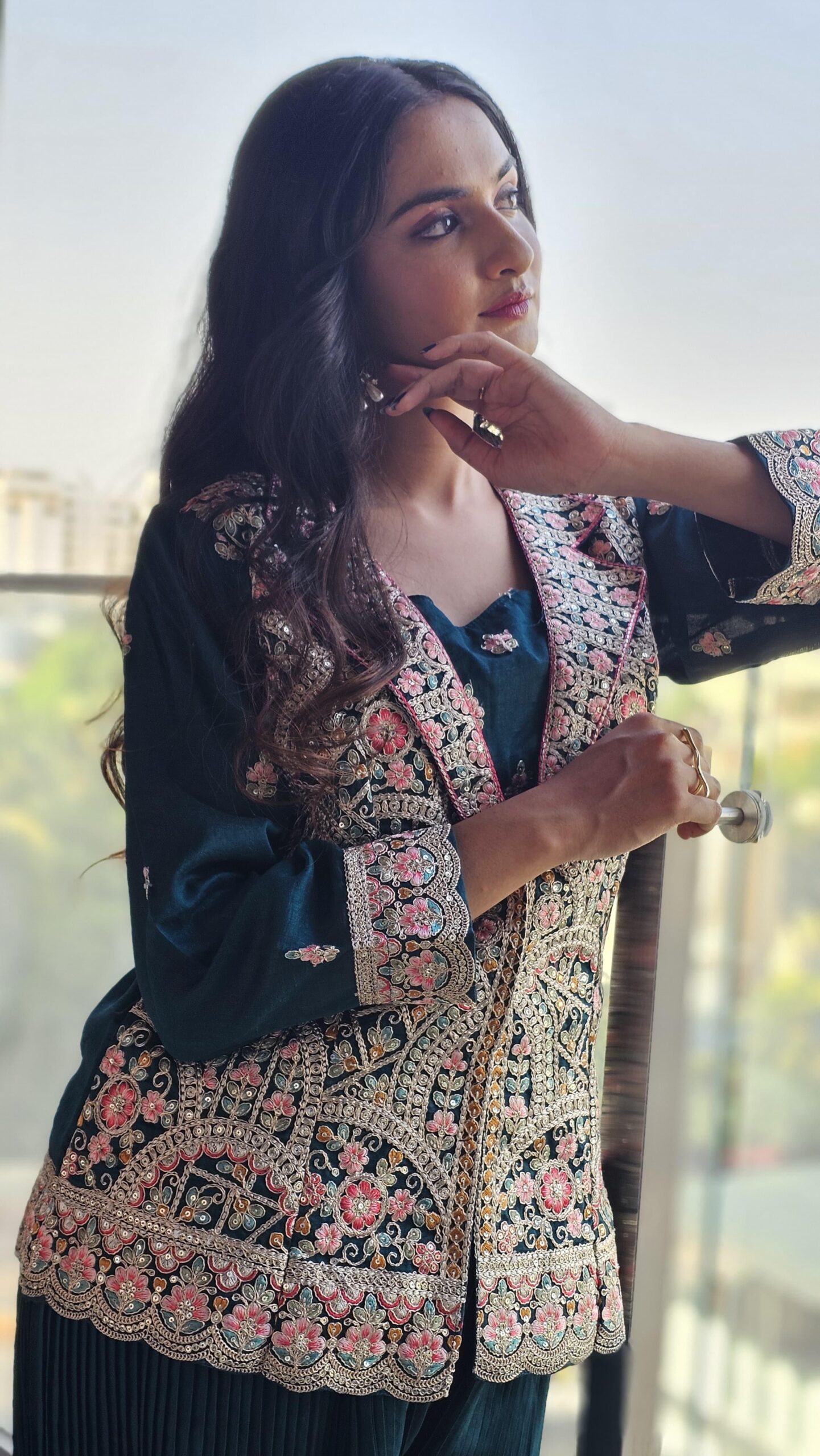 Embroidered Teal Jacket with Floral Design