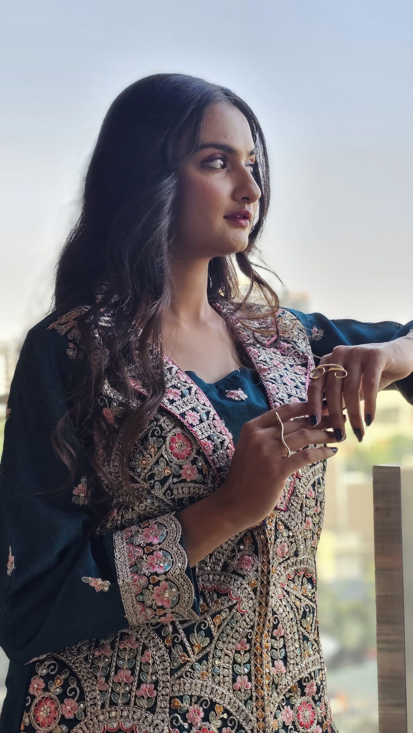 This stunning teal jacket is a true masterpiece of intricate embroidery and elegant design. Adorned with delicate floral patterns in shades of pink, gold, and silver, it offers a luxurious and sophisticated look. The detailed beadwork and sequin embellishments catch the light beautifully, making it perfect for special occasions or adding a touch of glamour to any ensemble. Crafted with precision, this jacket combines traditional artistry with contemporary style, ideal for those who appreciate unique and fashionable attire.