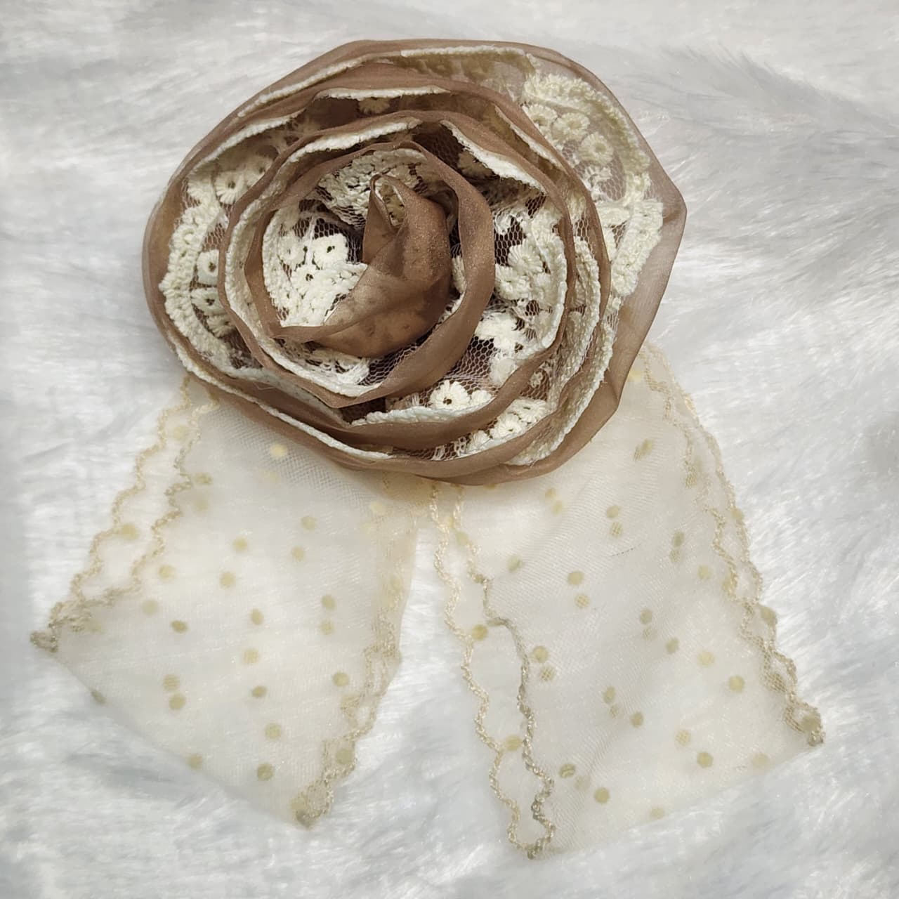 Sheer fabric (Chiffon/Organza) in pink and layers of Crochet/Guipure Lace in cream/ivory.
