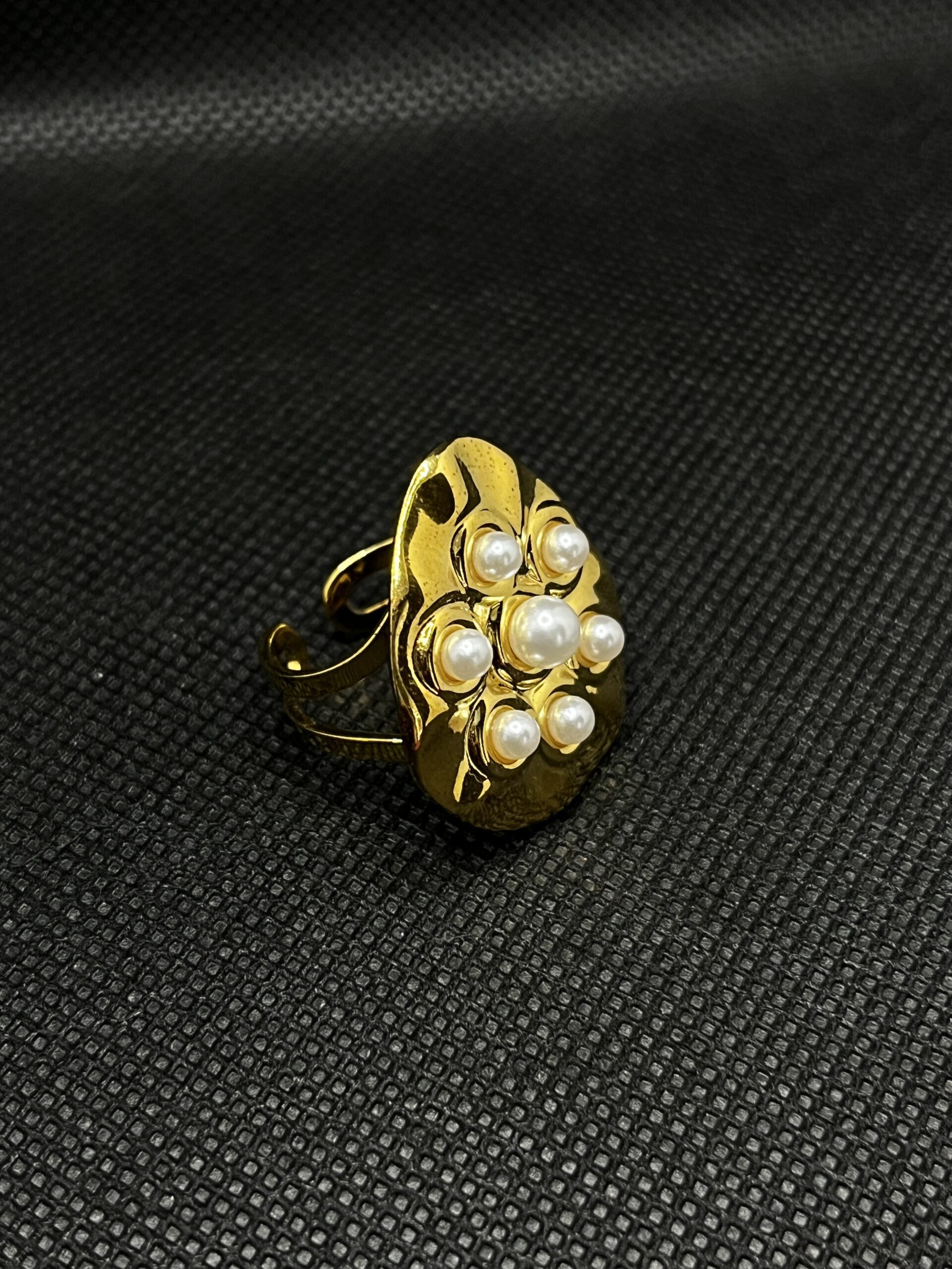 Embrace a regal touch with this gold colored statement ring featuring multiple lustrous white pearl-like beads. Designed to complement both formal and festive attire, this piece effortlessly balances elegance with opulence. Crafted from anti-tarnish stainless steel, the arrangement of pearls offers a soft, luxurious aesthetic that elevates your ensemble with grace. Perfect for special occasions, evening wear, or power dressing with a touch of sophistication.