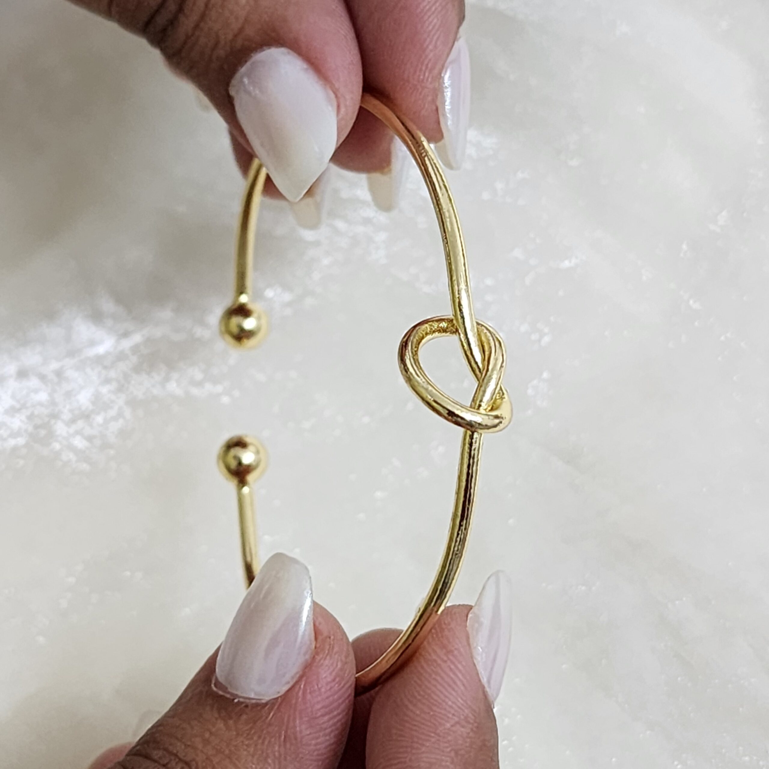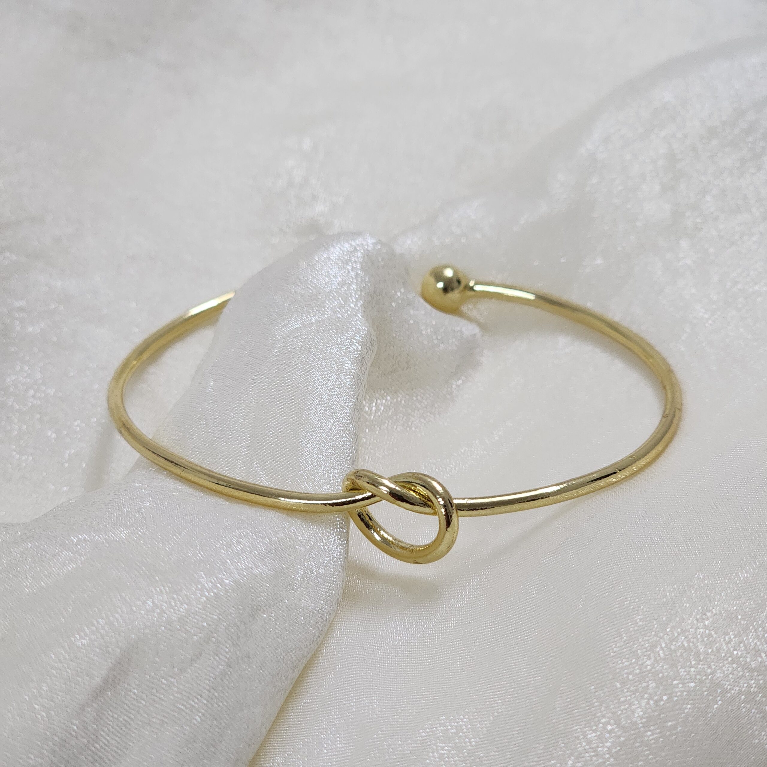 A sleek, open-ended gold-toned bangle featuring a beautifully crafted love knot in the center. The design is simple, elegant, and timeless. |