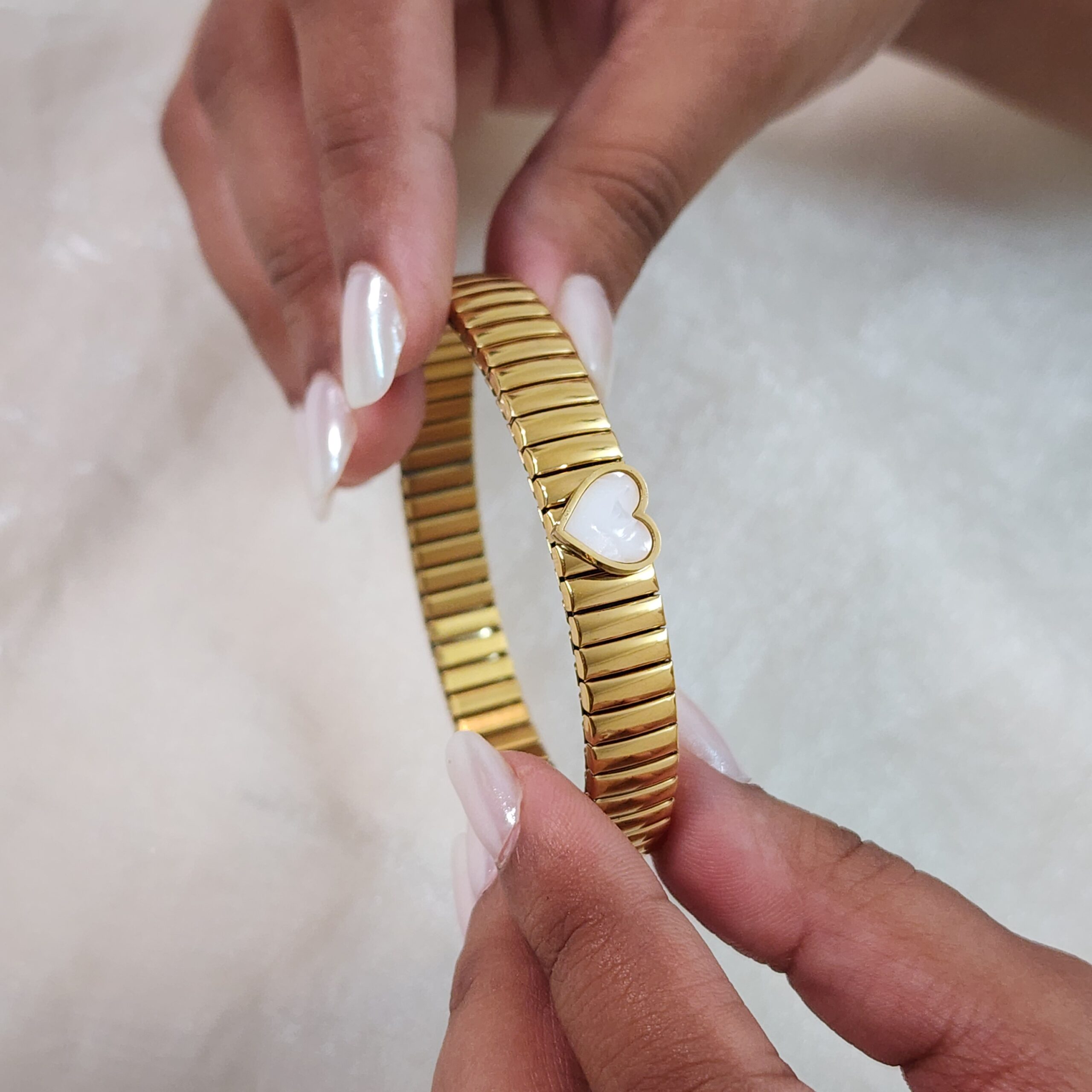 Add a touch of polished elegance to your wrist with this beautiful gold ribbed bangle. The detailed texture of the band catches the light for a luxurious feel, while the central mother-of-pearl heart adds a soft, luminous, and romantic detail. Its comfortable stretch design makes it effortless to wear, whether you use it as a standalone piece or stack it with other gold bracelets for a rich, layered look.