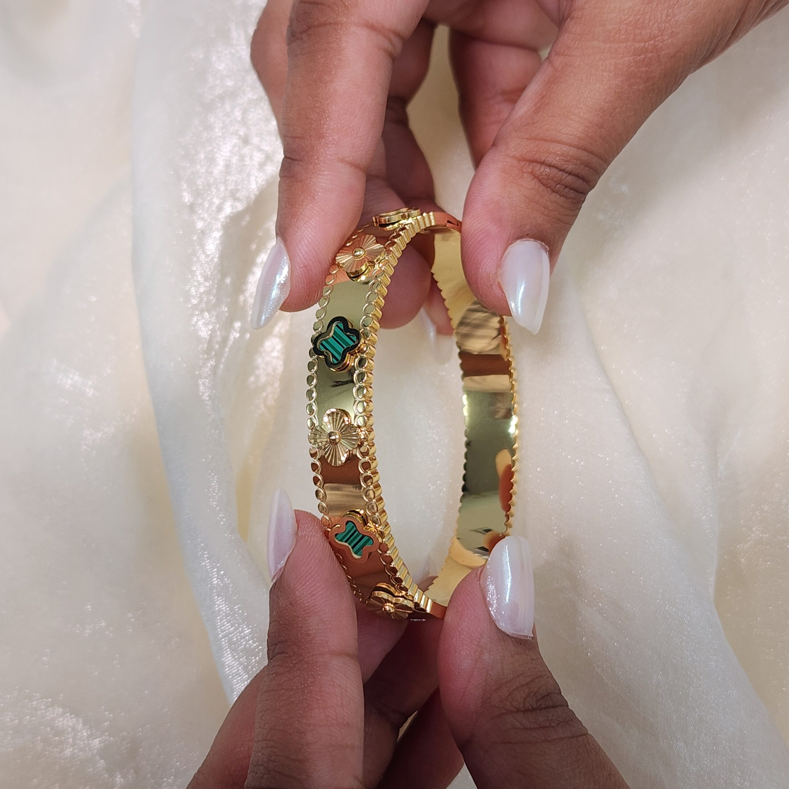 Embrace timeless elegance and a touch of natural beauty with this exquisite gold clover bangle. Featuring alternating textured gold clovers and vibrant green malachite-inspired inlays, this piece offers a rich and sophisticated look. It’s the perfect accessory to elevate your daily style or to add a luxurious touch to a special occasion ensemble.