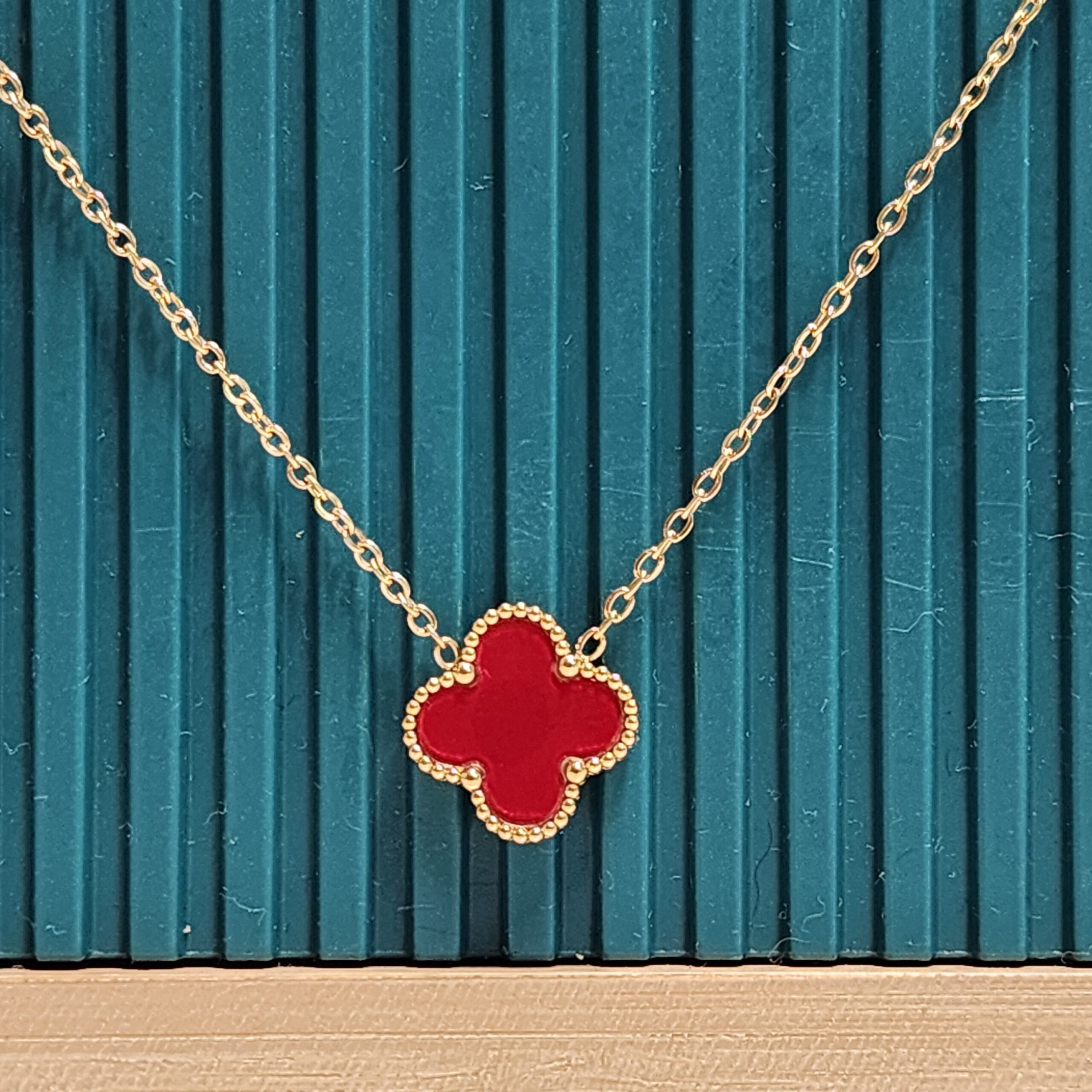 Bring a touch of good fortune to your style with this beautiful red clover charm necklace. The rich, ruby-red inlay stands out against the lustrous gold finish, making it a perfect statement piece on its own or a vibrant addition when layered with other chains. It’s a versatile piece ideal for everyday wear, adding a splash of color to your favorite looks.