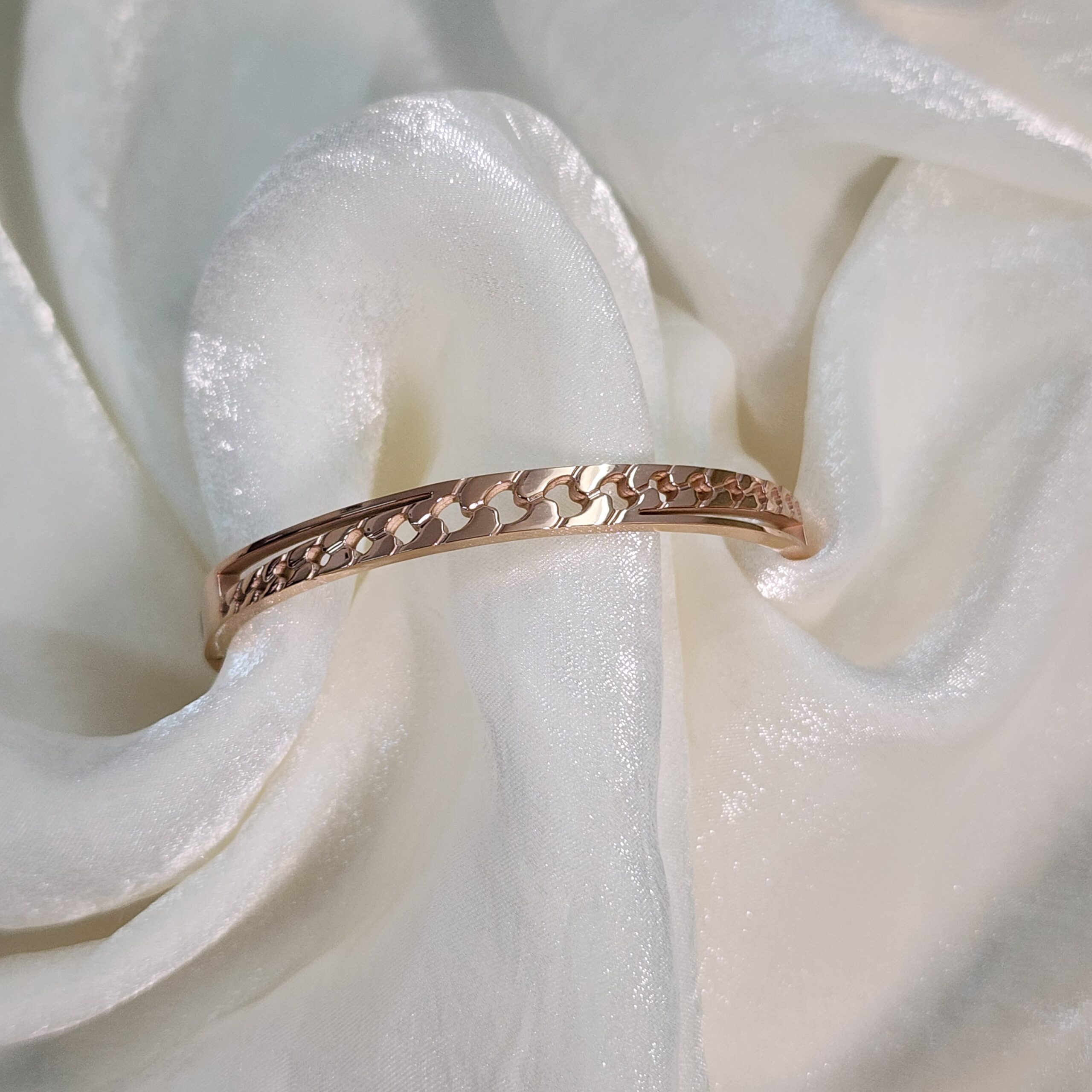 A sleek, open-ended cuff bangle with a double-band design. The upper band features an intricate, cut-out chain-link pattern, while the lower band is a smooth, polished surface, all in a beautiful rose gold finish. |