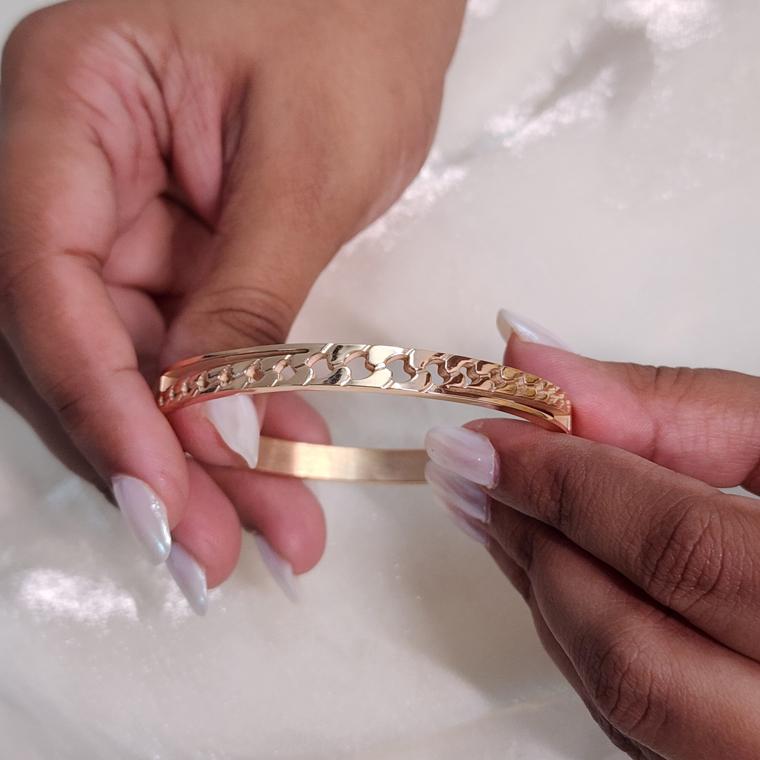 Add a touch of modern sophistication to your wrist with this stunning rose gold cuff bangle. The intricate chain-link cut-out design creates a unique visual texture, while the smooth, polished band provides a clean and elegant finish. Its adjustable, open-ended style ensures a comfortable fit and makes it a perfect piece for wearing on its own or for stacking with other bracelets.